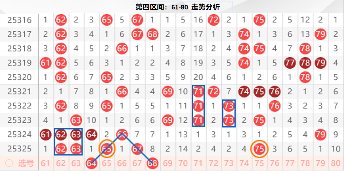 四区分析:【61-80】(走势图标注号码非小黄车大底,请谨慎参考,具体思路将在直播间分享讨论)