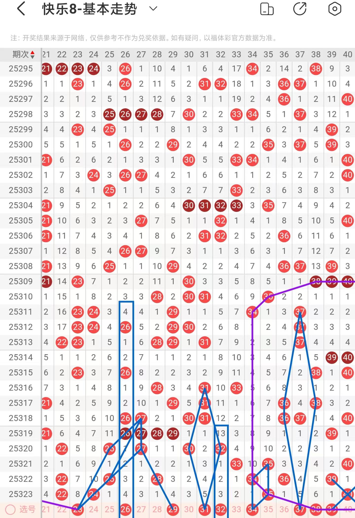 二区间上期小面积减少落号,一共开出四个号码球,本期考虑等同数量的号码球,梯形走势注意22、23号码球,注意直连转斜连走势的23、29号码球,同样23号码球也是斜连走势构成平行四边形形态的号码球,注意隔期对称回补的26号码球,26号码球也是百期相似形态号码。防守菱形形态的31号码球,注意防守百期相似形态的32、34、37号码球,注意期数和值加减法的38号码球,注意40号码球的分边落号,因此二区间关注23-26-29-32-38。注意本区间的选二复式23-26-29。