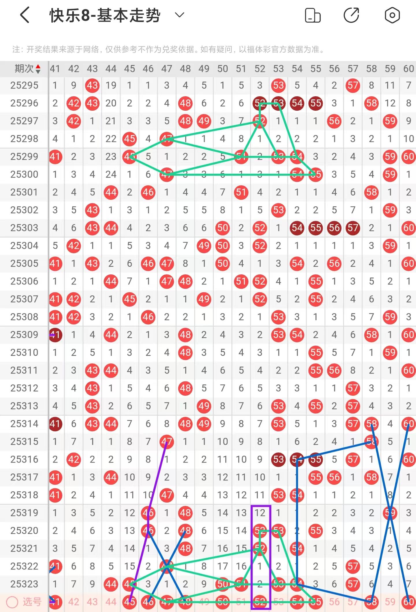 三区间上期大面积增加落号,一共开出七个号码球,本期考虑减少号码球的数量,注意斜连走势回补的41号码球,注意45号码球的重落回补,注意近期47、52、53、54号码球的走势相似,本期注意47、54、55号码球,注意50号码球的重落回补,注意百期相似形态的52号码球,注意近期53、54号码球同期下落,下期回补55号码球,以59号码球为交叉中心点,注意分边落号的58、60号码球,注意近期分边落号形态右侧号码球回落,因此三区间关注41-50-52-55-60,注意本区间的选二复式52-55-60。