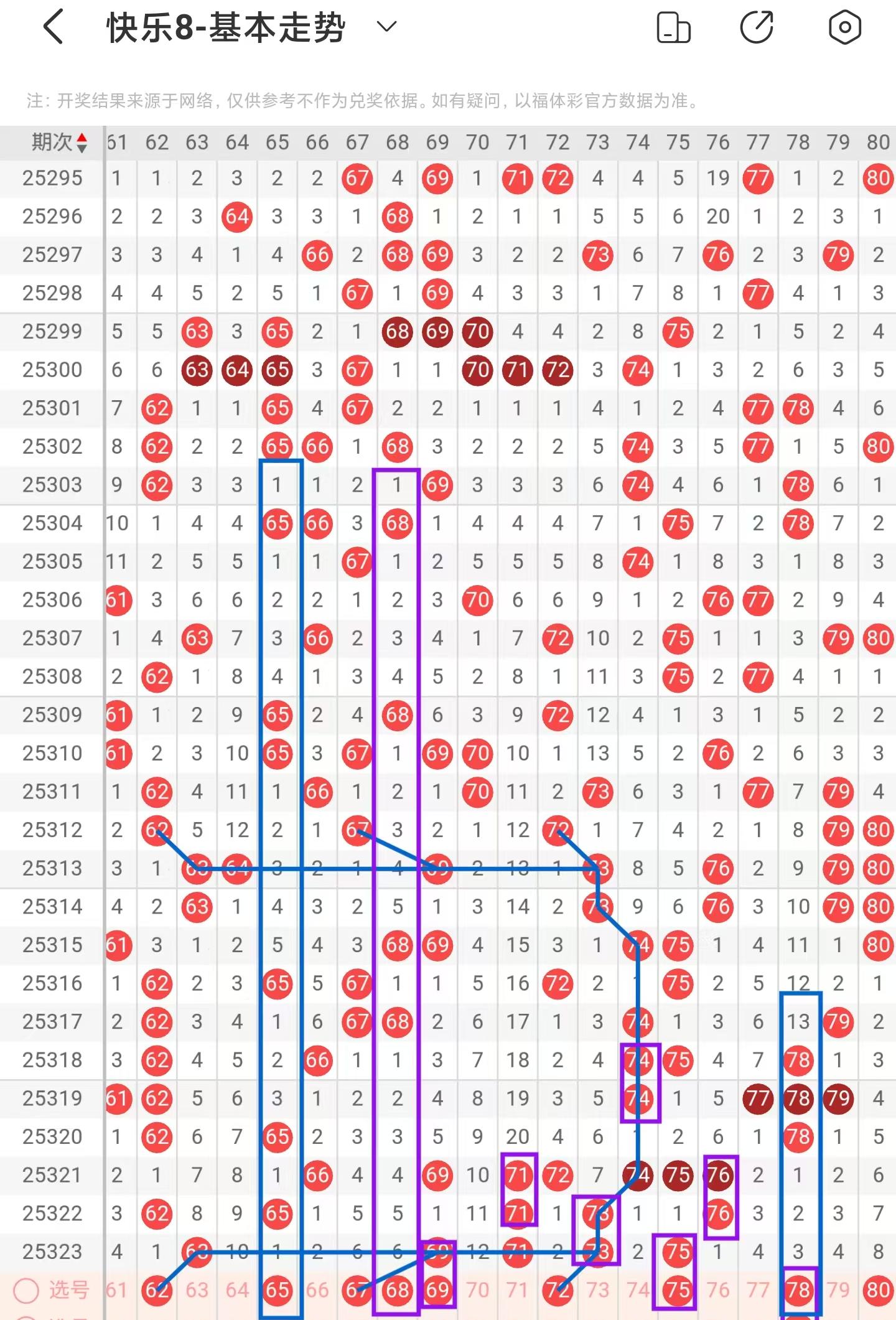 四区间上期稳定落号,一共开出五个号码球,本期考虑等同数量的号码球,注意区间的冷热态反复回调,注意隔期对称回补的62号码球,防守63号码球的重落,注意期数和值加减法的65、68号码球,注意斜连走势回补的67号码球,阶梯落位重码走势注意69、75、78号码球, 注意百期相似形态的72、78号码球,因此四区间关注62-67-68-72-78。注意本区间的选二复式68-72-78。