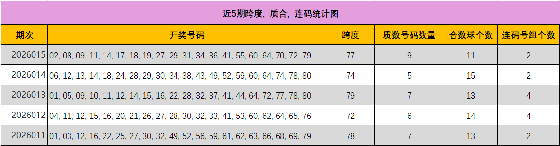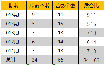 本期观点:上期质数回升至9个,为近期高点。近五期质数占比已提升至34%。预计本期质数个数可能从高点小幅回落,维持在7-9个的均衡偏高位。关注质数:02, 11, 17, 19, 23, 29, 31, 37, 41, 43, 47, 53, 59, 61, 67, 71, 73, 79。关注合数:08, 09, 14, 18, 27, 34, 36, 55, 60, 64, 70, 72, 76, 78, 80。