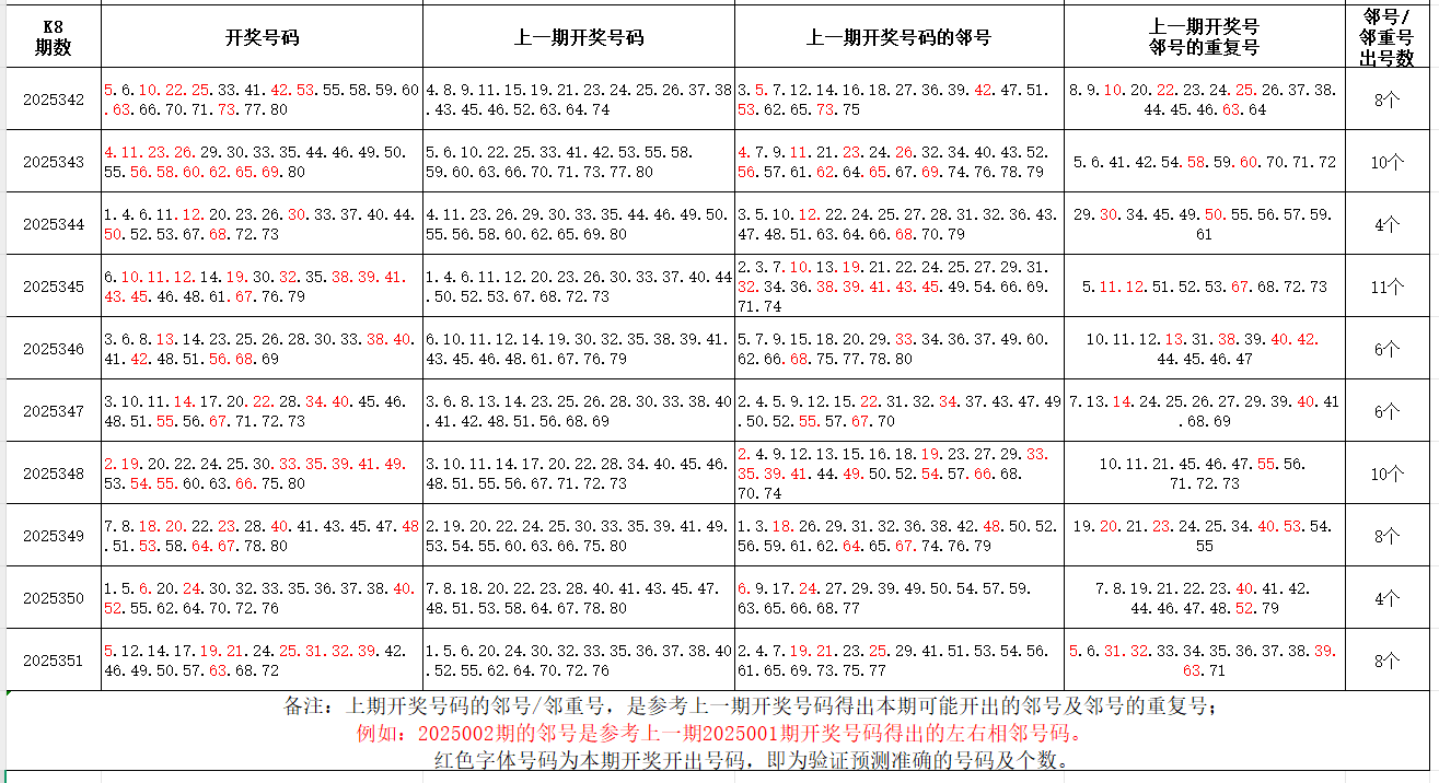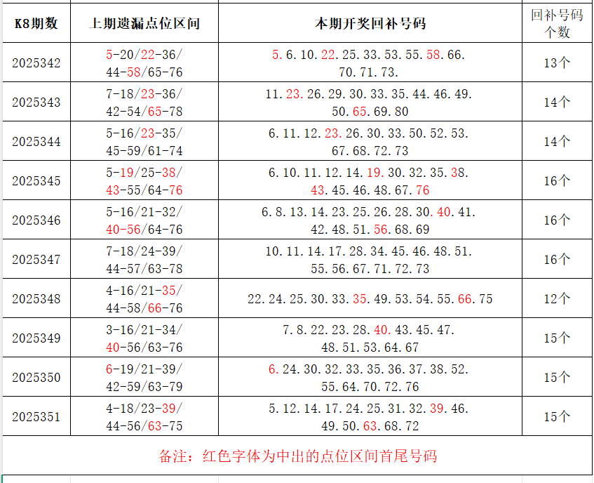 如图,上期的遗漏号码在下期开出10个左右,即为回补号码。定准点位区间首尾号码是关键!以上期2025351期为例,定位4个遗漏区间,围中15码!结合上期开奖号码,以跨度值大于或等于7为依据,本期关注3个遗漏区间:5-12/32-39/72-80;重点关注遗漏区间:6-18/20-33/42-56/64-78。点位区间号码和大底号码请勿混淆,个人分析,仅供参考。