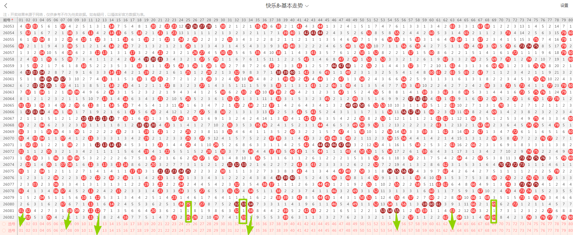 从这张走势图可以看到绿色方框标出来了遗漏一期的示意号码,开出了隔期(遗漏一期的)3个号码(绿色方块标示的),数量与上期一致,从近期走势图看隔期码回温态势形成,本期判断热度继续回温,落号6个号码概率较大(绿色箭头标示的01、08、12、34、55、63)需要关注,有下号概率;