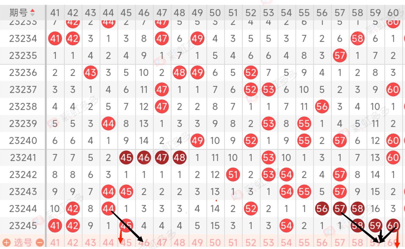 区间分析:三区在上期处于火热区出码,上期开出7个号码球,其中号码球58号球二连出,42号球二连出 三区近期处于热码区出现次数是比较多的,其中近期号码球54号去和57号球和58号球比较热码,本期重点预防号码球58号球的三连出和号码球60号球的二连出,以及预防45号球和46号球和59号球的开出!
