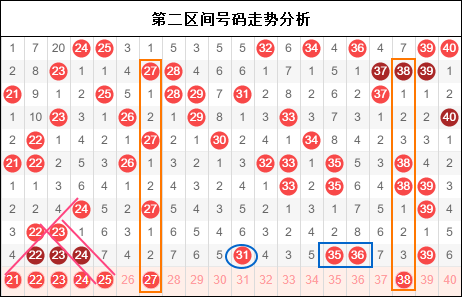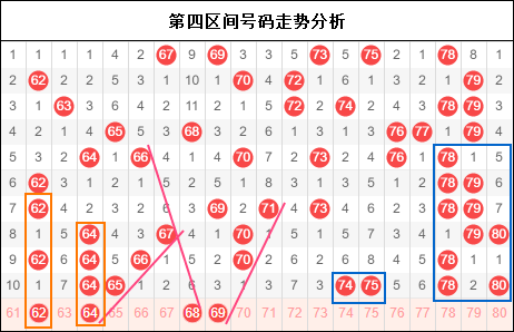 第四区间思路:四区走势绵绵不绝啊,两个大明码就这么明晃晃的出现了。后半部分依旧是苟延残喘的走势,看起来依旧是强势,但是到现在差不多是要告一段落了,一个区间那么多号码,不会紧着扎堆号码可劲的造,那走势转换势必就要进入号码更替,所以这一期大家注意一下。