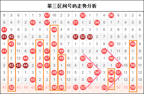 第二区间思路:二区将仅有的两个号码重号开了出来,且形成了三连号的走势。整个区间居然一下子成了热区,奈何走势上生无可恋,实在是找不到对应的走势。走出来的居然是两个跳空的隔开的大明码。而这一期根据前期的走势来看,还是要邻号作战的可能性比较大一些。