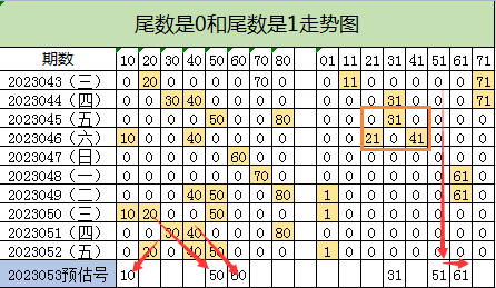 尾数1上期开出01号码,在近10期这个尾数开出号码多在每期1个号码,甚至空期遗漏这个尾数,没有号码明显走势下我们怎么来选号码呢?首先可以考虑同周期号码的重号走势,然后可以看到在045期号码31重号开出后是隔期两边斜开号码21,41走出了一个凸字形走势之后,时隔本期空档6期之间尾数1都是在号码01和61之间徘徊开出的,那么本期可以先大胆考虑凸字形号码有可能会走出回补凸起那个号码31落下在本期,而近10几期号码51都是遗漏状态的,在上期号码53开出后,本期可考虑这个喜欢和51,55相邻开出的最大遗漏号码51的回补落下在本期,考虑到近6期的号码都是在01,61之间开出,上期号码01稳定落下后,本期也可以考虑遗漏最大号码51的邻号61在本期稳定落下的可能性。