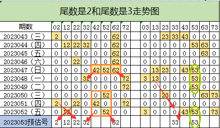 尾数2上期开出2个号码,这个尾数号码走势我们首先可以看到在047期号码42,52,62连号开出后,隔期开出号码32,72,这个形状走势下,号码42,52,72分别开出过,而号码32和62没有开出,那么再来看052期号码52隔期斜开051期号码41然后隔期在上期回补开出号码51形成一个常见的三角形走势,在这个走势下上期号码51继续斜开二连号走势基本是稳定的,在前面同期三连号走势下只有号码32和62没有开出,所以上期号码52我们优先考虑往后斜开本期号码62走出二连号的走势。