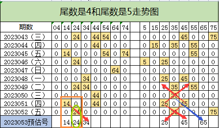 尾数4在上期开出1个号码24,这里我们可以优先看到上期号码24和051期号码14斜开的二连号走势,这个走势下可以看到两个走势可以落在本期号码上,首先051期号码14斜开上期号码24继续这个走势落在本期号码34上面的斜开三连号走势,然后是051期号码14斜开上期号码24补回落在本期号码14上由两个斜开连号走势形成的小三角。这种小三角走势在043期号码54斜开044期号码44然后隔期回补号码54上面就开出过,而尾数4在近10期没有开出过斜开三连号走势,所以我们可以看到小三角走势更为稳定,而在043期小三角走势上号码54在043期是连号44开出的,所以根据这个走势,本期号码24重号开出也是很有优势的。