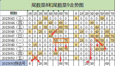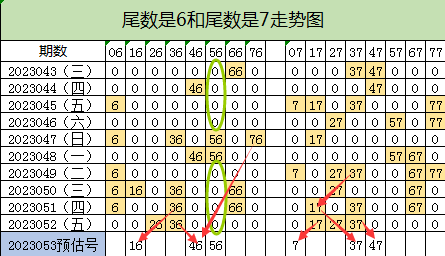 尾数3的号码上期开出4个,首先可以看到048期号码13空档1期斜开050期号码53落在上期号码33上面的空期斜开三连号码走势落空了,本期可以优先看到这个走势号码33回补开出的可能,然后在看到号码53在049期重号开出后似乎空档2期落在上期的,同样在044期号码53是空档2期落在047期就开始重号开出的,这个规律化空期走势下可以看到本期号码53重号开出的优势。这个尾数近10期开奖可以看到几乎在每期开出的号码上隔期开出重号的走势走出过两次,在044期号码63重号开出,还有就是在047期13,53重号开出,根据这两个重号走势,本期重号开出号码的走势就有优势了。