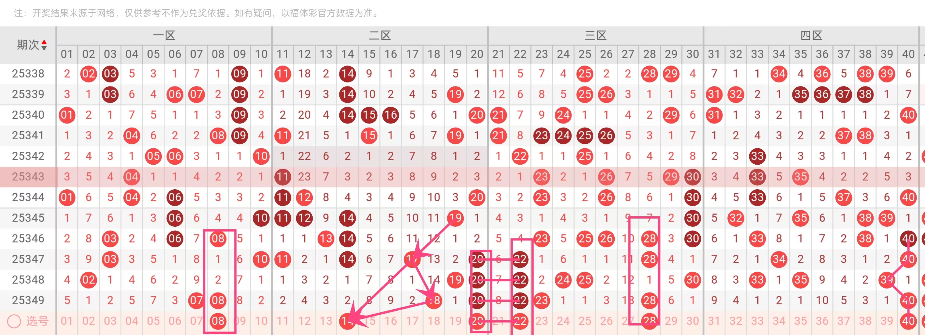 3次开出,位于中段28-30区间,该区间在近5期频繁出号(如28、30均出现3次)。号码28走势稳健,且常与22、40等热号联动,适合作为胆码。