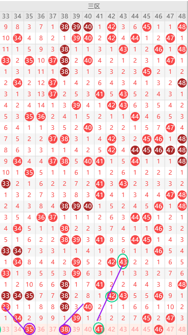 边号33 35 38 40 44 46 48出一码,重号防守39 45 47,形态上41 35是斜连号,上图已勾画,看好3开头出2码,近期一直出遗漏值大的号,本期36 37 44出一码,防43,关注五码35 37 41 43 46,一胆35双胆35 46
