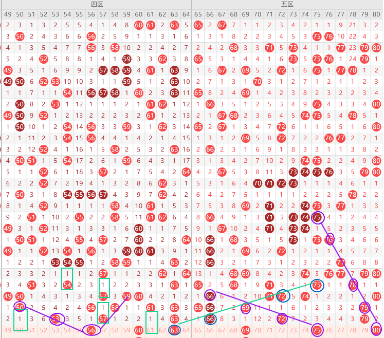 边号52 54 56 58 62 64出一码,重号53 57 63出一码,形态上56是斜连号,上图已勾画,遗漏值隔1期号出多期,本期隔一期号50 56 58 61出一码,遗漏值62 64二出一,短期规律三直落第二次回补喜欢遗漏2期回补,参考上面50 59,上期0尾断,本期0尾不会断,60主胆,关注五码50 52 56 60 64防63,一胆60