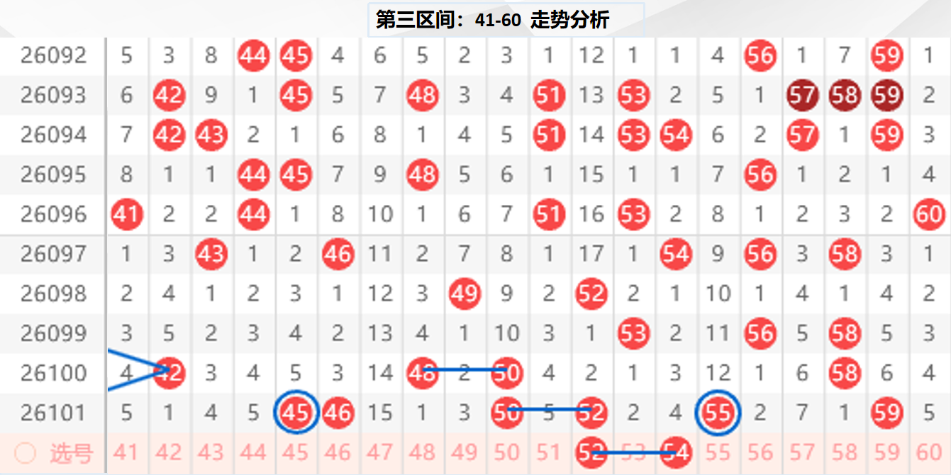 三区分析:【41-60】(走势图标注号码非小黄车大底,请谨慎参考,具体思路将在直播间分享讨论)