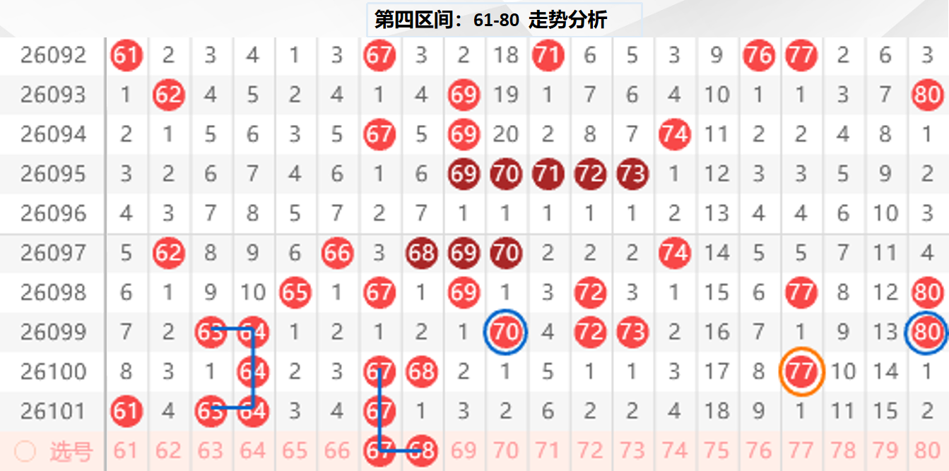 四区分析:【61-80】(走势图标注号码非小黄车大底,请谨慎参考,具体思路将在直播间分享讨论)