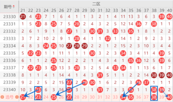 该区间的21号数字是属于遗漏10期的号码,本期遗漏10期的号码有2个,我们要注意出一个号码的情况。本期的25 29 33号数字都是空三中心号码,本期是有机会出一个号码的,重点关注一下25 29号数字的出号情况就行了。本期的23 27号数字我们要注意出重的情况。本期的32 34号数字都是三斜连号码,本期我们要注意出一个号码的情况。上期开出了38 39连号,本期我们注意出一个重号的情况。