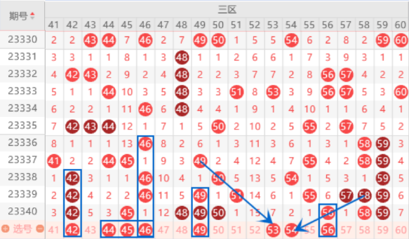 本期的42号数字我们防守一下42号数字出现4重的情况。本期的44号数字我们也是要防守一下的,出号机会还是有的。上期开出了48 49 50号数字的三连号,本期我们要注意一下出重的情况,重点关注一下48 49号数字出重的情况就行了。本期的53 54号数字我们也是要关注一下的,这里出一个号码的情况是很大的。上期开出了连号空一带号56 58 59号数字,本期我们要注意出一个重号的情况。