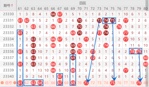 本期的61号数字是属于212走势,出号机会还是会有的,我们需要注意一下。本期的我们防守一下62 63 64号数字出一个号码的情况,重点关注一下63 64号数字出号情况。本期的67号数字我们注意一下走重的情况。本期的69号数字是属于空一对称号码,出号机会还是有的。上期7字头断号了,本期我们还是少做一点。重点关注一下71 75 79号数字的出号情况就行了。75 79都是属于连号回补的情况,出号机会很大。