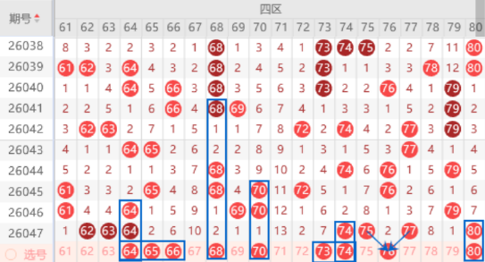 该区间上期开出来62 63 64号数字的三连号,本期我们注意一下出重号的情况,其中的64号数字我们防守一下出三重号码的情况。本期的68号数字是属于空二对称号码,出号机会是有的,可以防守一下68 70号数字同出的情况。本期的73号数字是属于空7对称号码,出号机会是有的,可以关注一下。上期开出了74 75 77号数字,本期我们防守一下夹号76号数字出号情况,本期的74 75号数字我们防守一下出重号的情况,其中的74号数字可以重点关注一下。