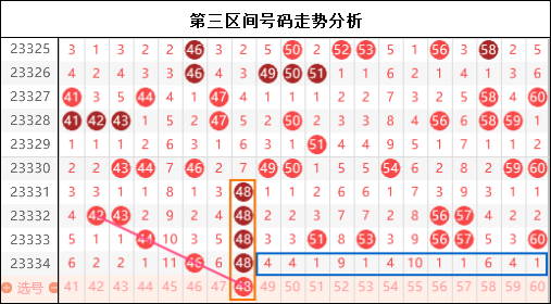 第三区间思路:三区有点不经夸,刚刚把两条主线收拢到一起,就发生严重的断区事件。多码之后甚至都不做减半处理,直接将为两码走势,按照二区的概念,本期三区极有可能模仿走势,出现比较不错的连码布局,不管两条主线中哪一个回归,至少本期三区在走势上是不会弱于其他区间的。