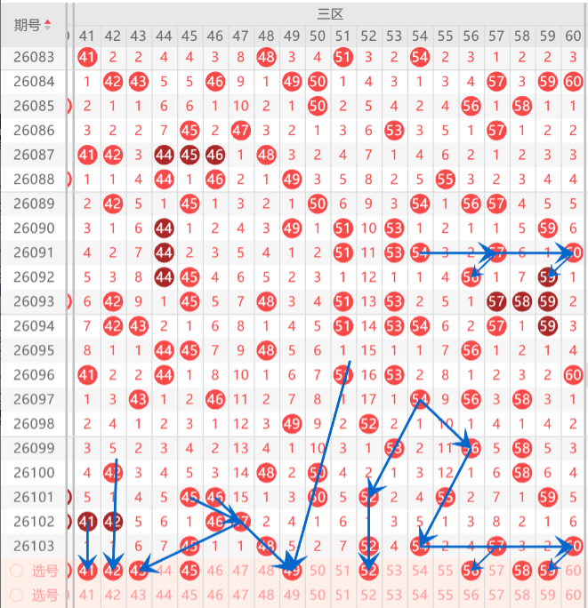 三区间在近期的走势上分析,三区间是走热形态,上期三区间开出了6码,而且上期开出的形态是两连号分边和空位回补走势,上期小妹在文章中布局到了4码开出,那么本期重点关注的形态是隔期回补,孤码分边,斜连号下拉,那么本期首先注意隔期回补上的41.42.47中选择1码回补机会,而孤码分边上注意51.53.55.56.59中选择1-2码分边机会,至于斜连号下拉位置上44.49.中参考一码下拉机会,上期重点关注在空位回补上布局到了4码开出,那么本期重点关注在孤码分边上布局一码订胆机会,如图所示。