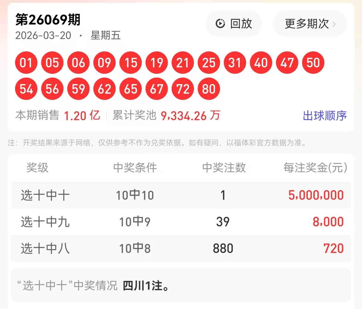 上期福彩快乐8第 2026069期开奖号码为【01 05 06 09 15 19 21 25 31 40 47 50 54 56 59 62 65 67 72 80】,其中大小比10:10,奇偶比为12:8,和值为784,跨度79,四区间比为6:4:5:5。下面是对本期对于每个号码的详细分析。