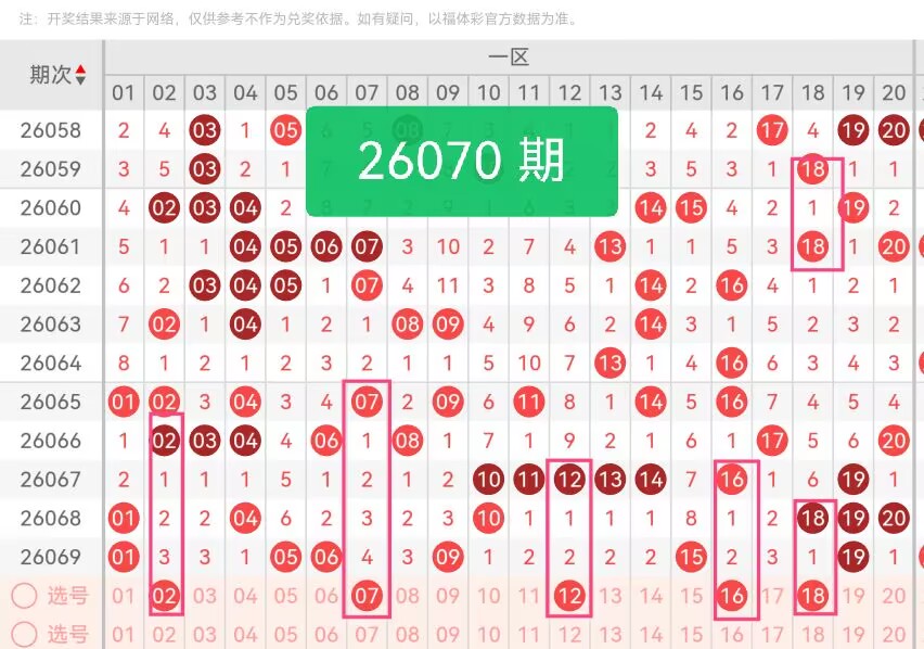 上期第一区间开奖6个号码,本期可能会减少开出。02作为前端小号,承接上期01、05的出号节奏,保持小号区间活跃度,避免前端断层;07为中段奇数,平衡一区偶数占比,让号码节奏更稳健,与周边号码形成合理间距。12处于一区核心位置,是承上启下的关键号码,衔接前后段走势,适配整体分布逻辑,提升组合稳定性。16、18为一区后段偶数,形态规整、衔接流畅,既避免与上期重号过多,又能守住区间出号重心,奇偶比例协调,大小分布均匀。