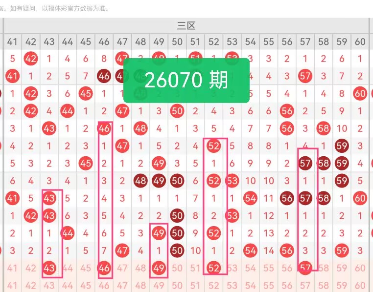 上期第三区间开奖5个号码,本期可能会稳定开出。43、49守住三区前半段,以奇数为主,筑牢区间前端基础,与上期47、50的出号节奏衔接顺畅,保持核心区间活跃度;46为中段偶数,平衡奇偶比例,让组合更协调,衔接前后段号码,避免区间中段断层。52、57覆盖三区后半段,分散布局、间距适中,无扎堆现象,提升区间覆盖力,适配整体均衡格局。