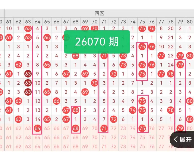 上期第四区间开奖5个号码,本期可能会稳定开出。64、68稳守四区中段,作为区间过渡号码,衔接前后段走势,避免区间中段空缺,保持四区连贯性;71、75、79发力四区后端,以奇数为主、收尾有力,覆盖四区尾段关键位置,防止尾段断层,与上期72、80的出号节奏自然衔接。