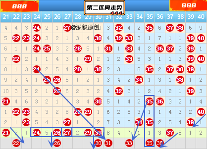 上期在该区间开出了24 26 27 29 30号这个连号空一带号类型,本期这里我们要重点考虑它们出重号的情况,这里应该会落下2个重号下来,我们一定要抓一抓。其次就是连号34 35这里,昨天直播时说它们的周围33 34 35 36要断号,果然真断号了,那么本期我们就可以在这里作战了。