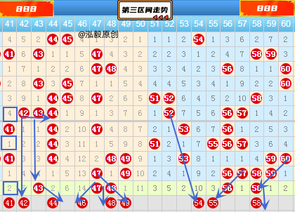 昨天直播一直在讨论43 45 46 47出那个,最后结果我还是按照我的思路选了45 47,结果出了43 47,既然上期开出了43号,那么本期的41 42 44我们既要注意,这里应该也是要有号码开出了,尤其时42 44要重点关注一下。本期的冷号46号我们也是要防守的。本期的三角形56 57 58我们要重点关注,它的角重号和角斜连号55 56 58 59号应该会出1-2个号码,我们可以抓一抓的。