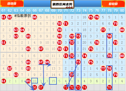 该区间的大三角形61 63 65我们需要防守的,尤其是角重号61 65本期很可能会出一个出来,我们要注意。上期65号以后断号了,那么本期的7字头就有搞头了,该区间有两个冷号66 69,我们要注意开出一个号码的情况。其次就是71 72 73 74 75形成的多类型组合号码,本期应该要回补1-2个号码了,我们要重点考虑。