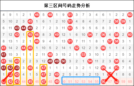 第三区间没有出现的预期加热,号码个数上反倒是减了两码。而且很大概率上给我们留下了44和46的两个大坑去填充,果不其然昨天很大一部分人在这里跌倒,甚至不乏一些大奖的缺失都是因为44造成。但是在整个主线的走势上下一期依然是暗含了存在的轨迹,并且相当清晰明了,就看你是不是用心做了分析。