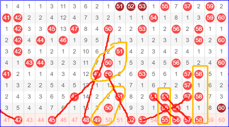 第三区间号码41-60,三区分两部分看,前半段冷出个水来,后半段走势还凑合。我一直紧盯这一块,像一区这样的冷区都开始活跃,这个41-50依然纹丝不动,真的式佩服它。我们秉持追热不追冷的原则,依然还是去看这一区间的后半段。上一期咱们直播间现场看好的金胆56,双胆56 50还是不错的。