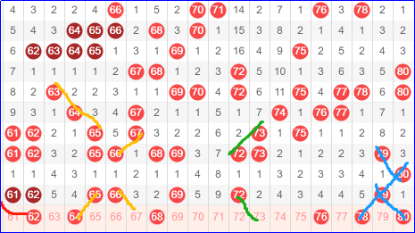 第四区间号码61-80,对于第四区间号码,我只想到一句话,丫丫了个呸的。这套路太深了,估计没几个人玩转。上一期我在分析第四区间的时候,最后一句话,重点写了一句,注意上一期的连号回补,我估计没几个人注意到这句话。如果注意了,那可真是赚翻了。重复了七个号码。很多人估计会猜想,是不是下一期又要搞事情断掉了。我觉得即使是断掉了,也要去做一下防守。机会总是在有准备的时候出现的。