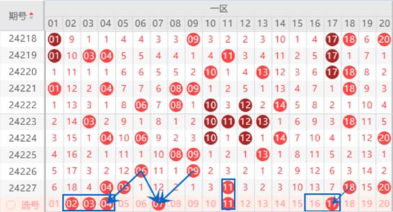 该区间的08 10号数字是属于交叉对称号码,在最近的走势上,08 10同出形成的交叉对称号码都是出号了的,所以本期的08 10号数字我们要注意出号数字,本期的08号数字是属于空二对称号码,上期开出了11号数字,本期是有机会走分边的,本期的12 13 14号数字存在断号风险,所以本期的10号数字也是有出号机会的,这里我们可以防守一下08 10号数字同出的情况。