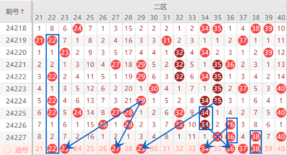 本期的22号数字我们注意一下出号情况,本期是属于212走势,本期这种走势有两个,另外一个是13号数字,本期的13号数字存在断号情况,所以本期的22号数字是有出号机会的,本期我们可以注意一下22 23号数字同出的情况。上期开出了连号空一带号35 36 38 40号数字,本期这里我们是要注意出重号的情况了,本期的40号数字出重机会不是很大,重点关注一下36 38号数字的出重情况,尤其其中的36号数字是属于3重号,34 35号数字都是三重号以上,那么本期的36号数字也是会出3重号的,我们要注意一下。