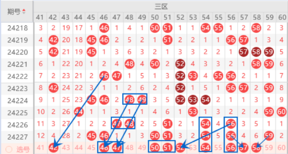本期的49号数字我们注意一下出号情况,属于镜像复制号码,51出重的51 50 49号数字的斜连,和上面的刚好形成对应号码,我们要注意出号情况,最好是做一下防守,这里可以重点关注一下46 47号数字出一个号码的情况,毕竟是属于连号的斜连号码,还是有机会出一个号码的。本期的51 54 56号数字我们注意一下出一个三重号的情况,其中的51号数字我们可以重点关注一下。