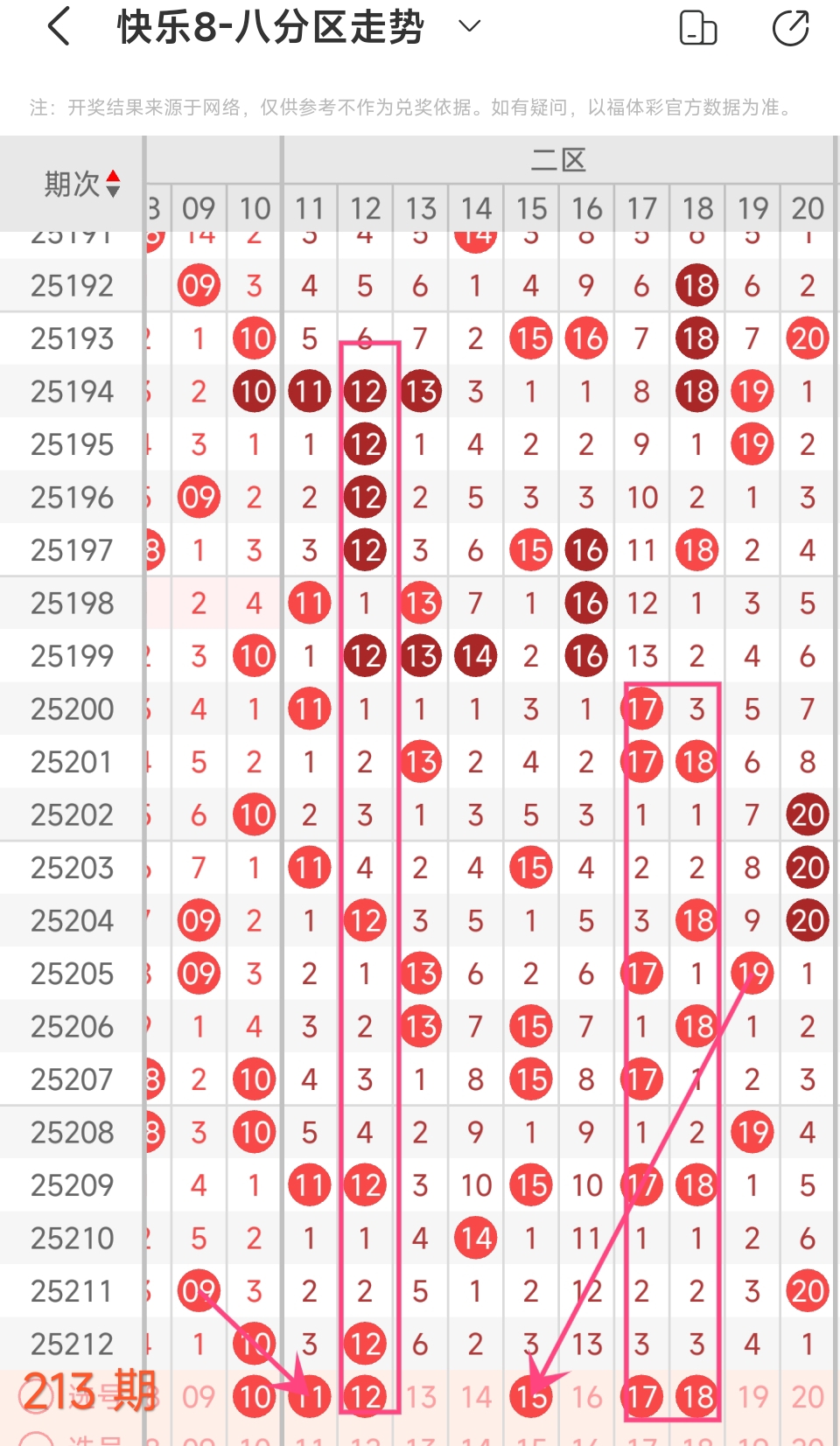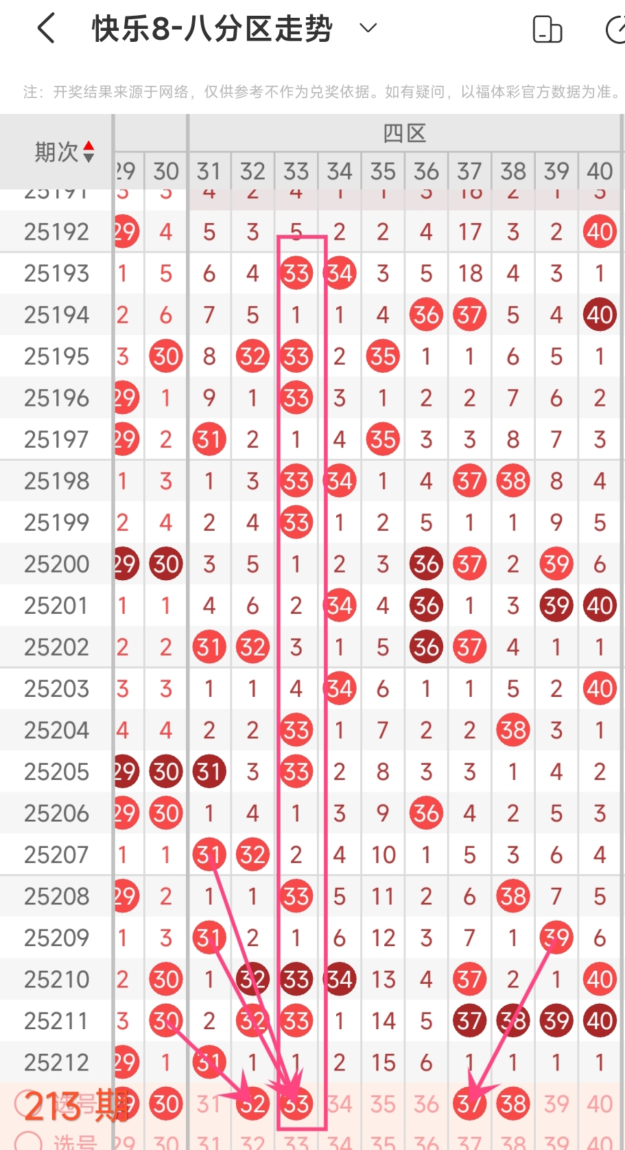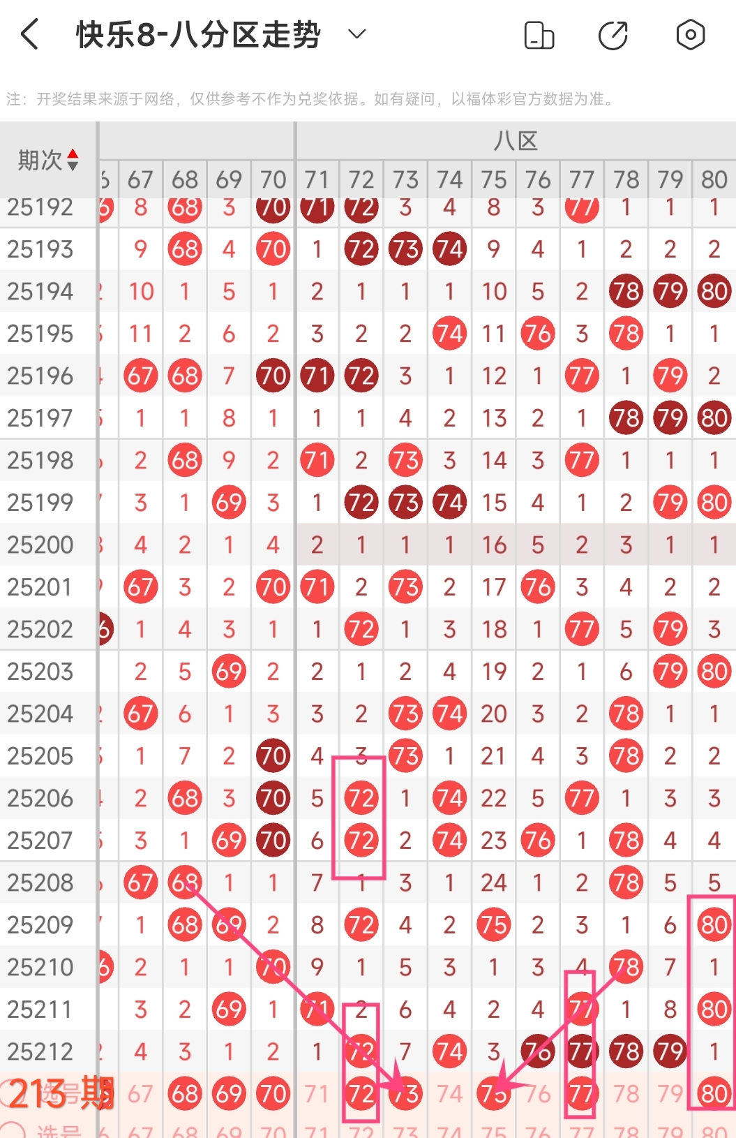 在快乐8的探索之旅中,通过对开奖走势图细致入微的观察,我们总结出一些具有参考价值的规律。几乎每一期开奖号码都呈现出以下显著特征:其一,大概率出现连号;其二,常常伴有边码;其三,遗漏值为1 2 3的号码频繁现身;其四,重号现象也较为常见。掌握这些要点,能为我们的投注提供方向指引。我们约定采用八分区走势图来展开分析。