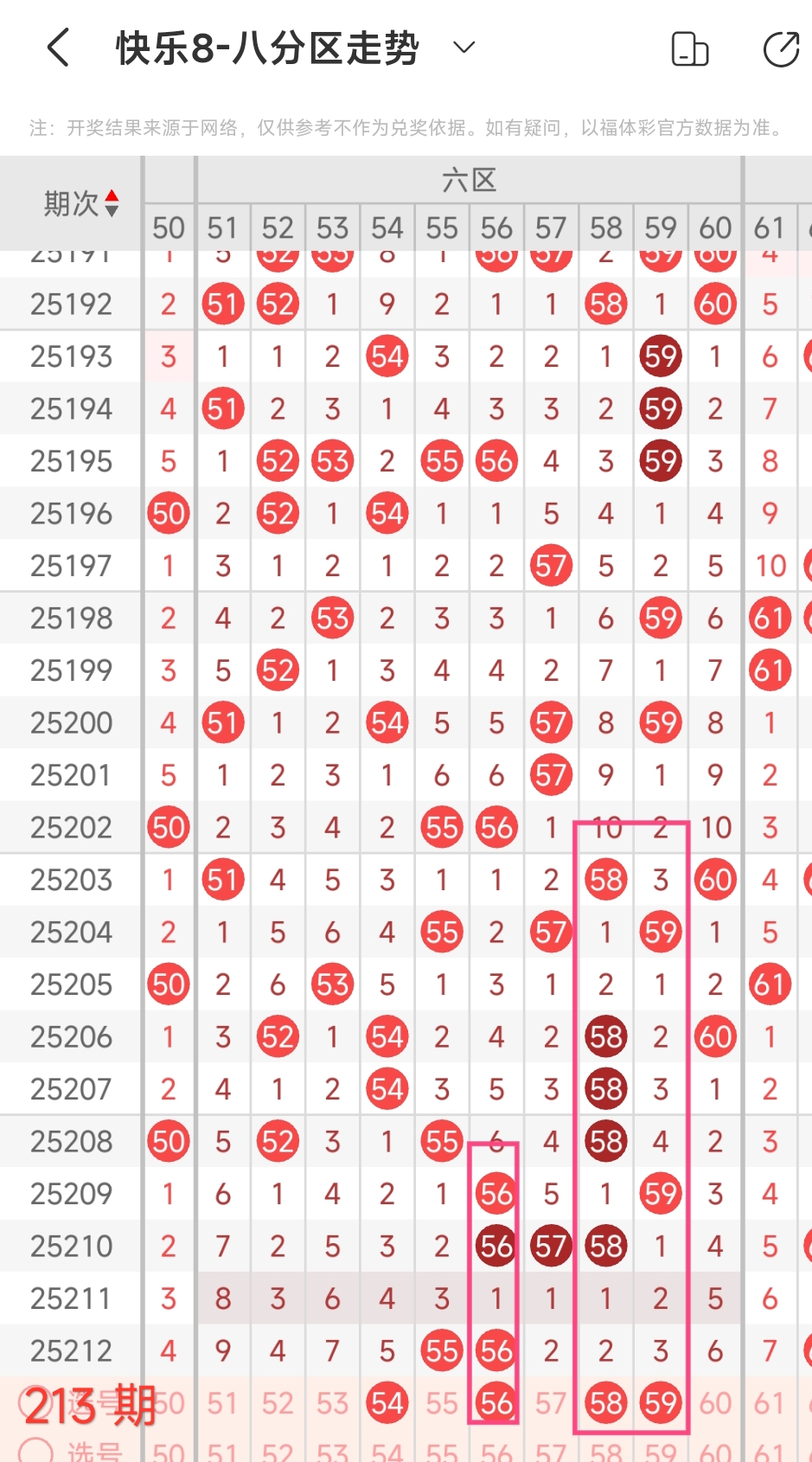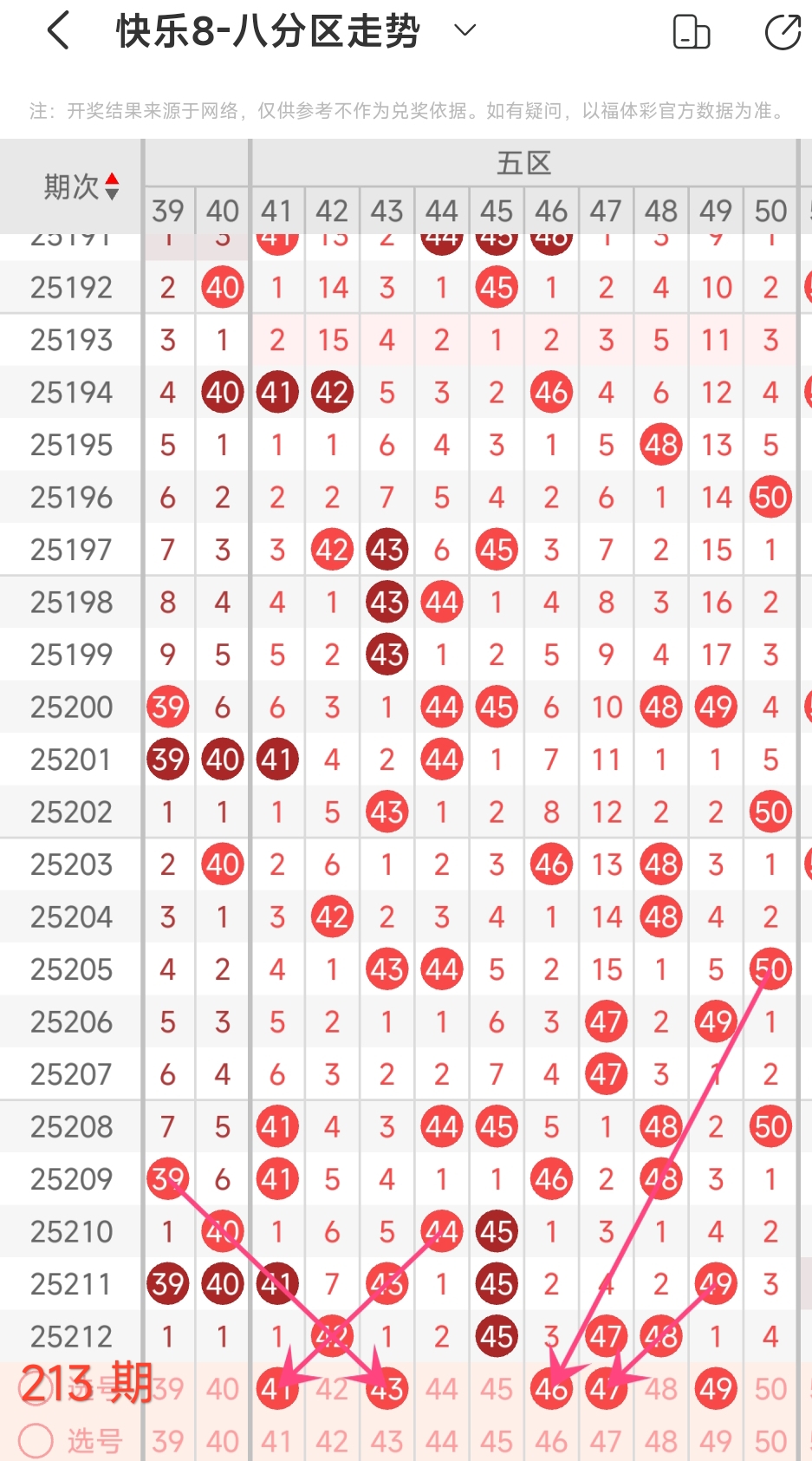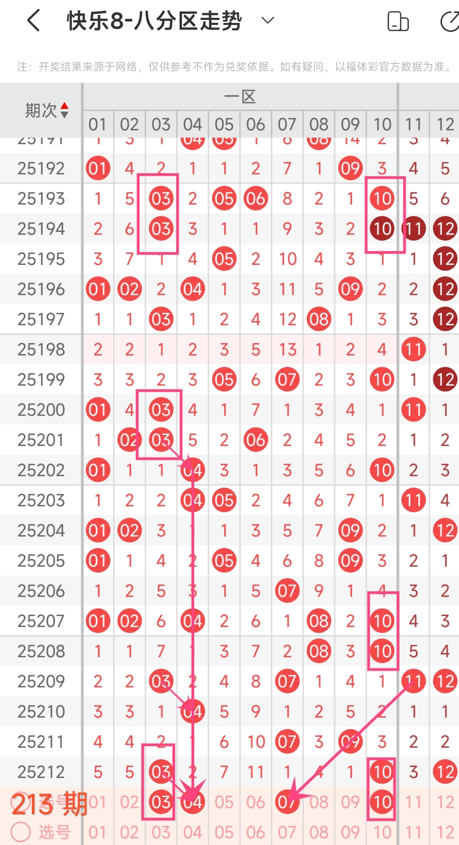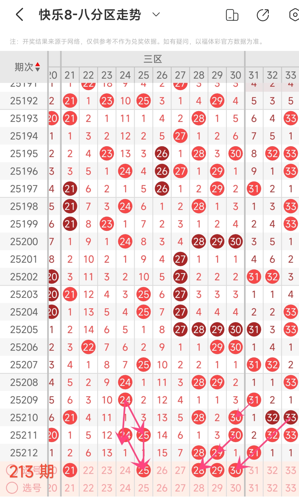 在快乐8的探索之旅中,通过对开奖走势图细致入微的观察,我们总结出一些具有参考价值的规律。几乎每一期开奖号码都呈现出以下显著特征:其一,大概率出现连号;其二,常常伴有边码;其三,遗漏值为1 2 3的号码频繁现身;其四,重号现象也较为常见。掌握这些要点,能为我们的投注提供方向指引。我们约定采用八分区走势图来展开分析。
