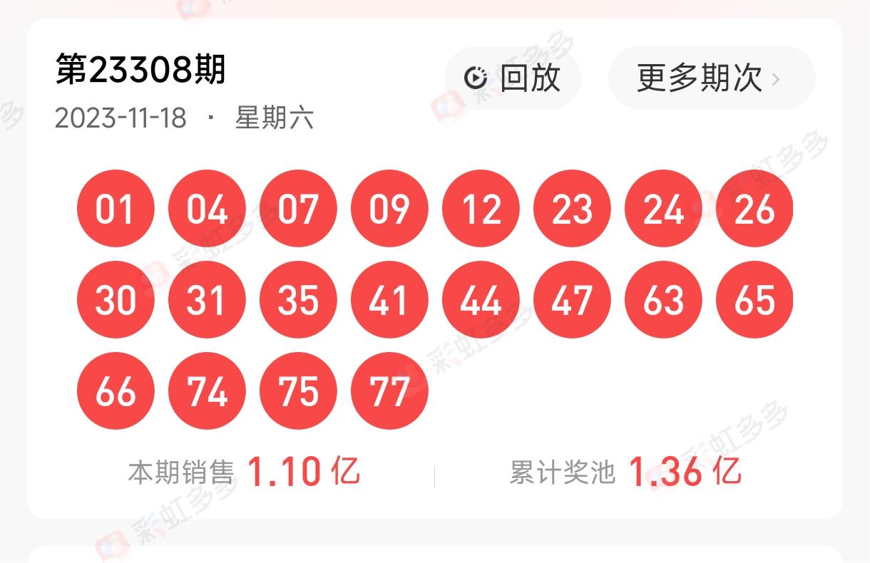 首先回顾上期的开奖号码:01 04 07 09 12 23 24 26 30 31 35 41 44 47 63 65 66 74 75 77
