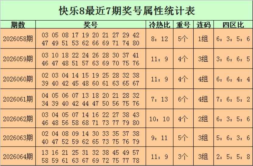 福彩快乐8第2026064期开奖回顾:13 16 21 25 31 32 38 45 49 57 58 59 61 63 67 69 72 75 77 78,其中奖号冷热比为11:9,开出3个重号:38、59、75,四区比为2:5:5:8。