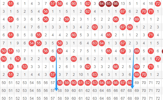 上图是福彩快乐8奖号码走势分布图其中一部分,我在上面走势图中标注出来的数字一共有11个,这11个数字上期只开出了一个数字63,最近两期这个区域也只出现了3个数字,那么本期这个区域出号码的机会是有的,关注这个区域出数字3个或者4个,个人最看好数字5859 6061 6566。