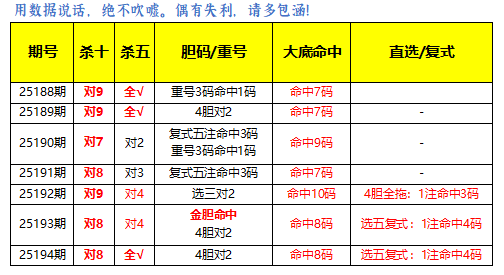 上期杀10码对9,杀5码全对,复式五注命中3码,重号3码命中1码。
