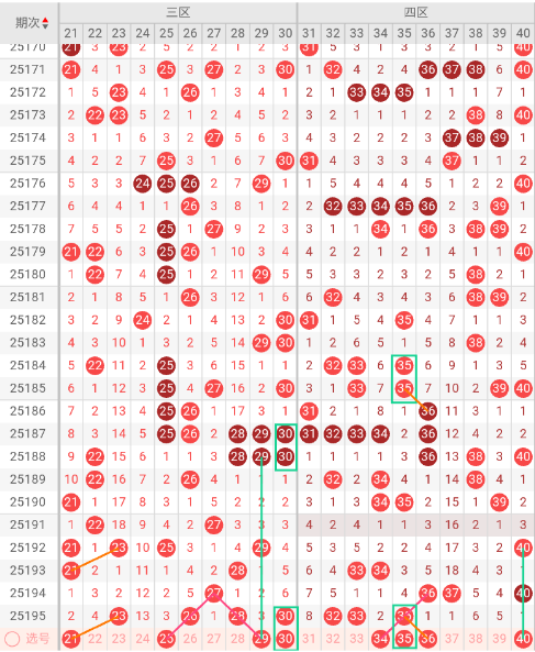 四区开出:32,33,35 奇偶比: 2:1 和值:100 跨度:3,上期开出3个号码,奇数号码占优势。本期三斜连走势:34,无隔码斜连走势。近5期出号量:0-1-2-3-3,近10期平均出号2.5枚,上期奇偶比: 1:2。本期推荐关注号码:34、35、36、40。