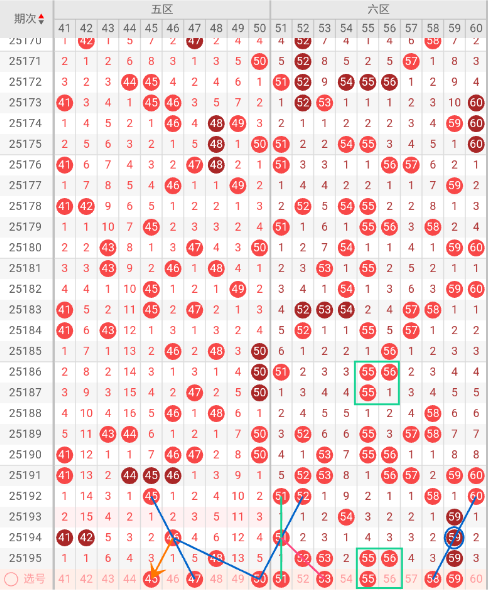 六区开出:52,53,55,56,59 奇偶比: 3:2 和值:275 跨度:7,上期开出5个号码,奇数号码占优势,重号:59,重号数:1。本期三斜连走势:53,隔码斜连走势:58。近5期出号量:6-4-2-2-5,近10期平均出号3.1枚,上期奇偶比: 2:0 ,本期推荐关注号码:51、53、55、58。