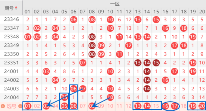 该区间的01 02号数字本期我们注意一下落下一个号码的情况,重点关注一下01号数字的出号情况。本期的05号数字我们注意一下出号情况,可以防守一下05 06号数字出号情况。本期的08号数字我们注意一下,毕竟上期开出了10号数字,本期是有机会把08号数字带出来的。本期的13 14 15号数字我们要注意出一个号码的情况,重点关注一下13 14号数字的出号情况。本期的17 19号数字我们注意一下,都是有出号机会的,可以重点关注一下。