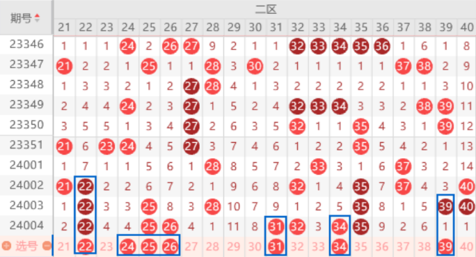 本期的22号数字我们注意一下走4重的情况。上期开出了25 26号数字,本期我们注意一下出一个重号的情况。上期开出了31 32 34 35号数字,本期我们这里也是要注意出重号的情况的。本期的35号数字应该是走不了4重号,本期的32号数字也是不好出重,所以本期我们就重点关注一下31 34号数字出重的情况就行了。三连号39 40 41号数字上期没能出重号,那么本期我们就要注意回补一个号码的情况了,重点关注一下39 41号数字回补的情况就行了。