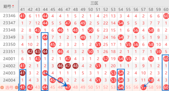 本期的44号数字是属于121走势,本期是有机会出号的,我们注意重点关注一下。本期的47号数字是属于连号回补情况,出号情况也是有的,可以关注一下。上期开出了51 53 54号数字的连号空一带号,本期我们注意一下出重号的情况,重点关注一下53 54有一个走三重的情况。本期的57号数字我们注意一下出号情况,防守一下57 60号数字同出的情况。