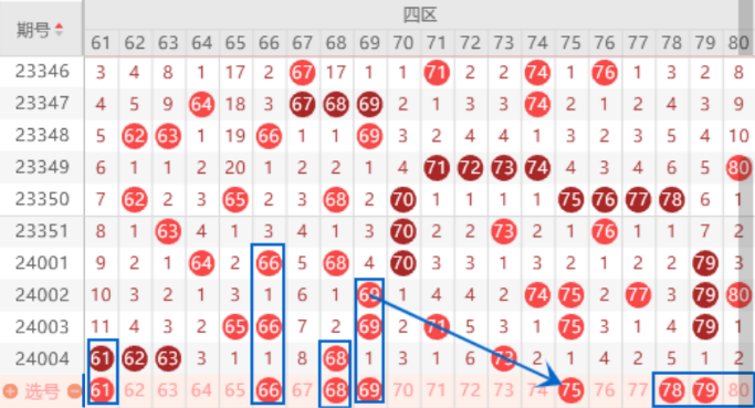 该区间上期开出了61 62 63号数字,上期又开出了51 61号数字,所以本期我们注意一下61号数字走重的情况。本期的65 66号数字我们防守一下落下一个号码的情况。本期的69 75 79号数字我们注意回补一个号码的情况,这里应该是会出一个号码的,我们重点关注一下,尤其是78 79 80号数字出一个号码的机会很大。